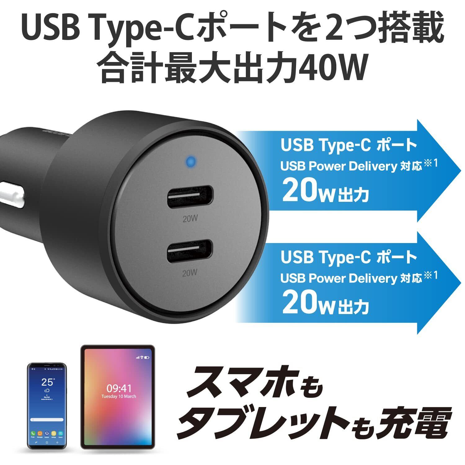 エレコム カーチャージャー シガーソケット USB-C 最大40W (2ポート合計) USB PD対応 20W USB-C×2 2台同時充電 12V24V対応 [iPhone 14/13/12/11/SE3/SE2、iPad 等対応] ブラック EC-DC09BK