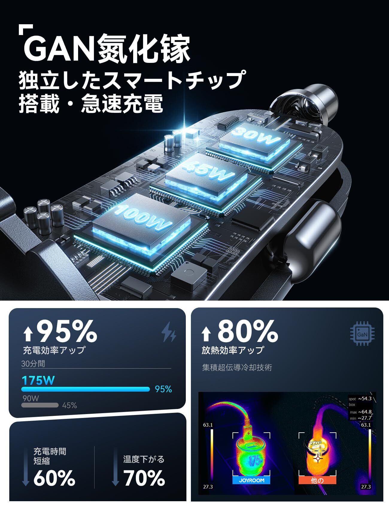 JOYROOM シガーソケット USB-C カーチャージャー 175W 【100W USB Cケーブル付き・急速充電】3ポート【PD 100W/45W+QC3.0】独立3チップ設計 多重保護 車載充電器 ノートPC/パソコン/MacBook/iPhone/Android/など対応