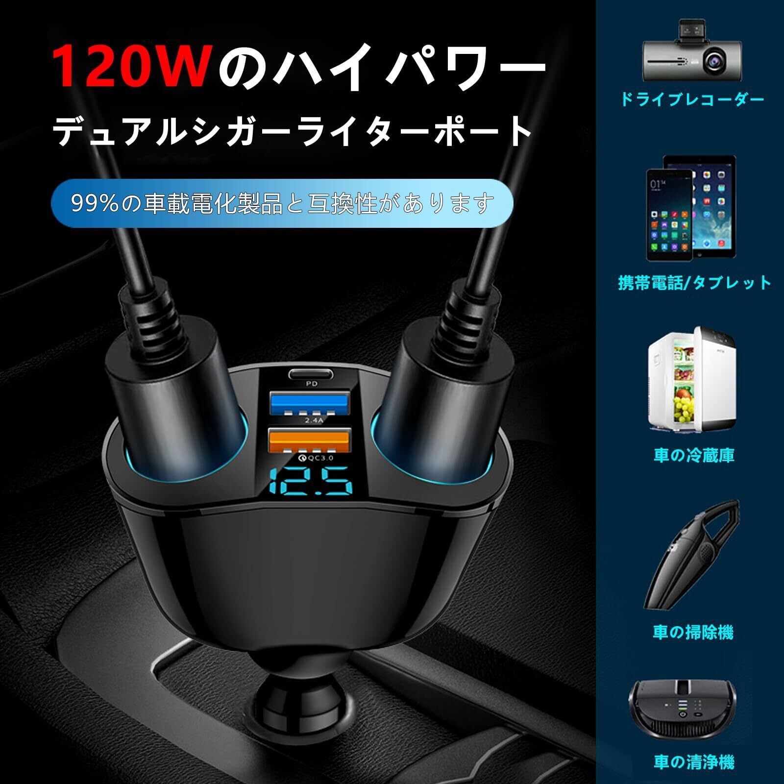 - 特徴:シガーソケット×2、USB QC3.0ポート、LED付