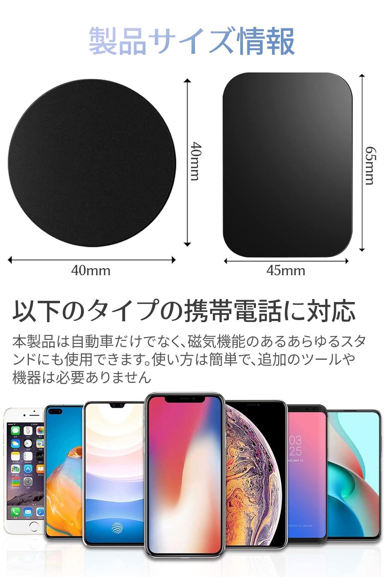 【サイズ・仕様】丸型メタルプレート:直径42mm、厚さ0.5mm;角型メタルプレート:45.5mm*65.5mm、厚さ0.5mm。 ほぼすべての4.2-5.6インチのスマートフォンに対応。