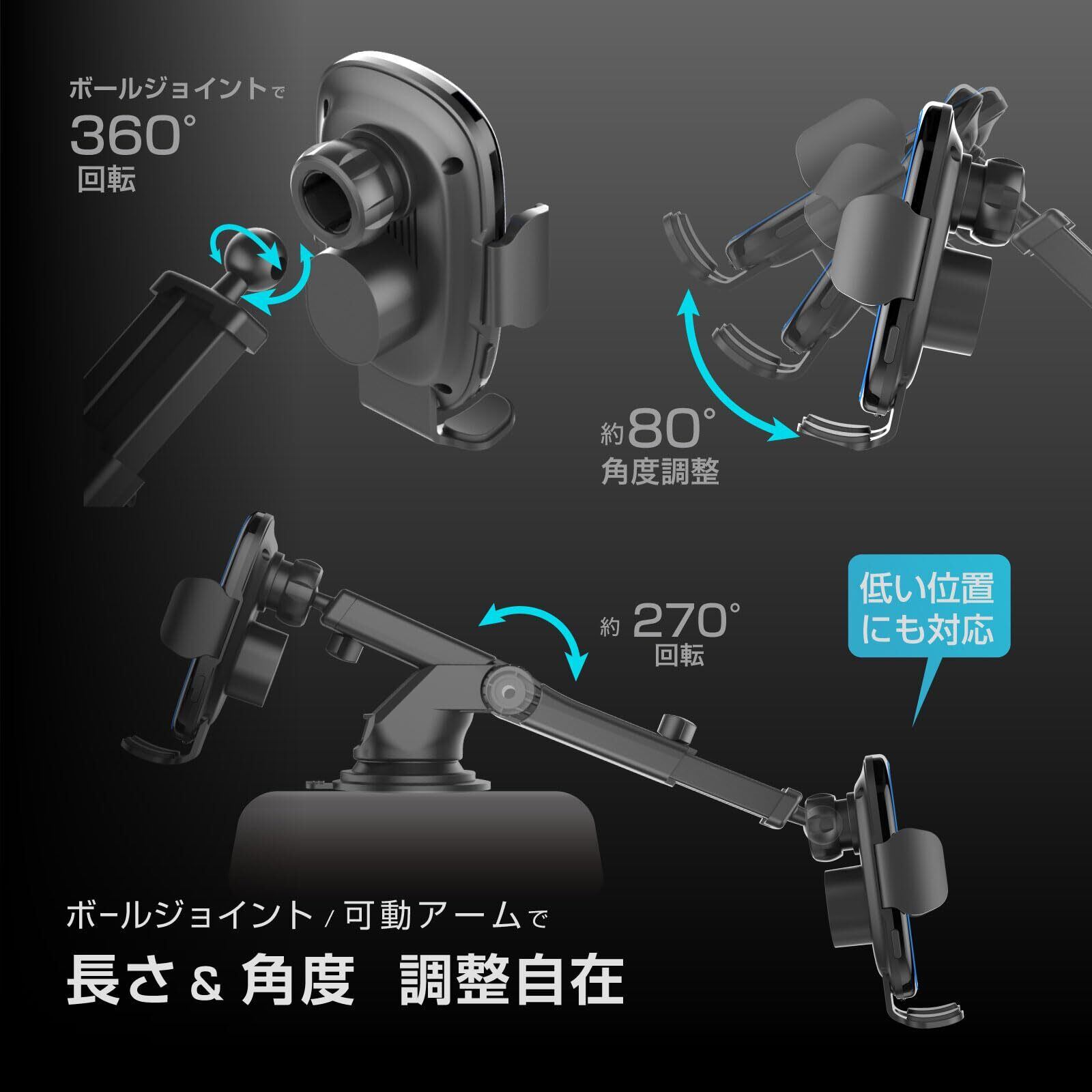 ワイヤレス充電(Qi)対応スマートフォンを置くだけで左右アームが自動でホールド。