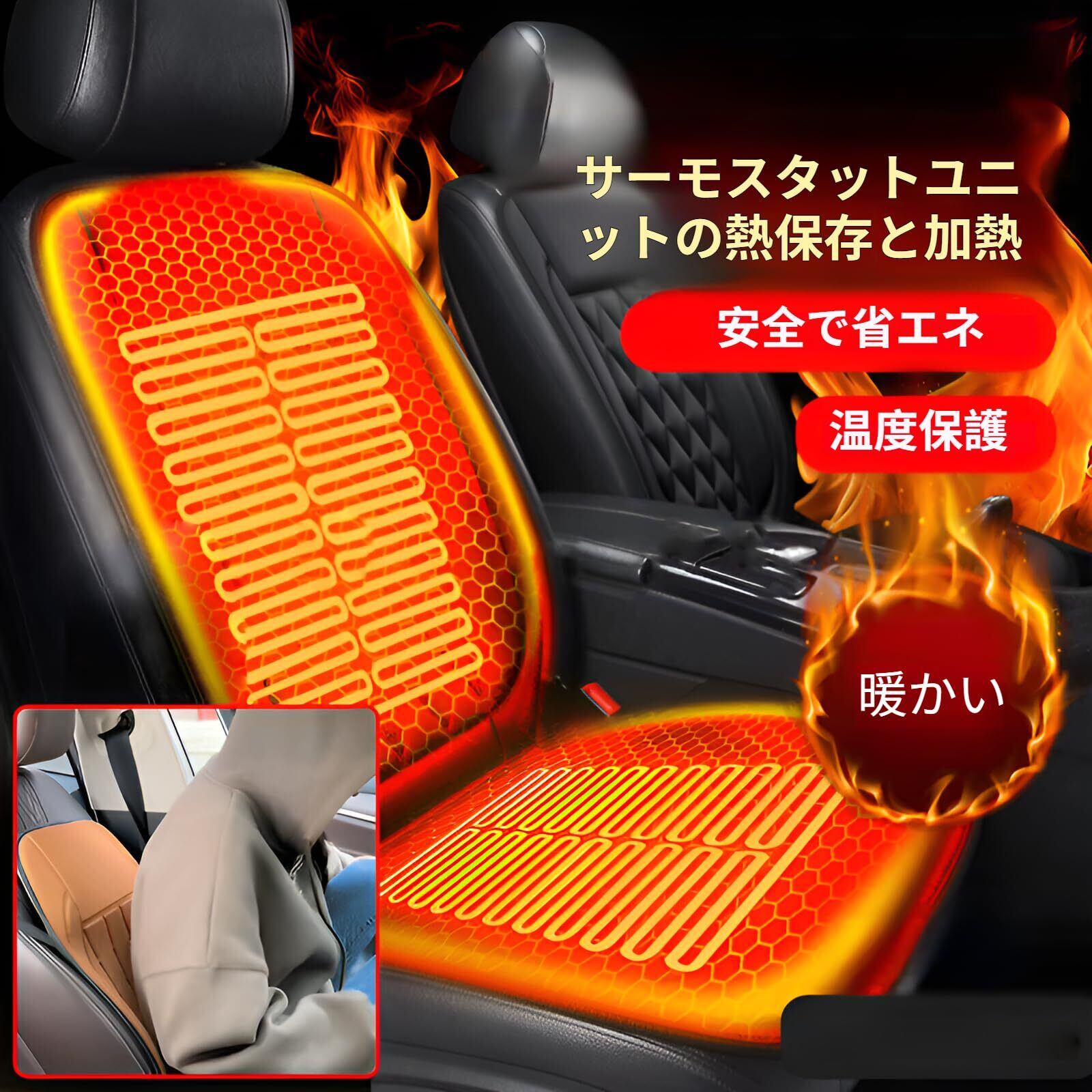 1【寒さを感じさせない快適空間!】この車載ヒーティングシートは、12Vの低電力で運転中や通勤時に快適な暖かさを提供します。セラミック発熱体を採用しているため、すぐに温まり、冬の寒さからあなたを守ります!