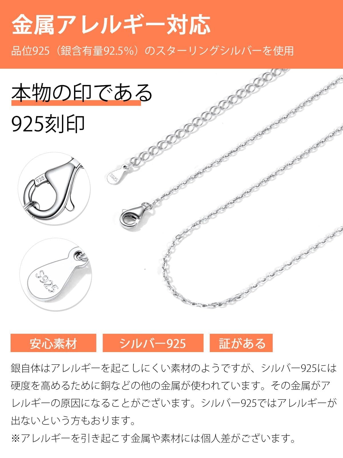 [低アレルギー素材] お肌に優しいシルバー925素材を使用していますので、着けっぱなしにしていたり汗をかいても痒くならなく、金属アレルギーの方にも安心してご使用いただけます。※すべての方にアレルギーが起こらないことをするものではありません。