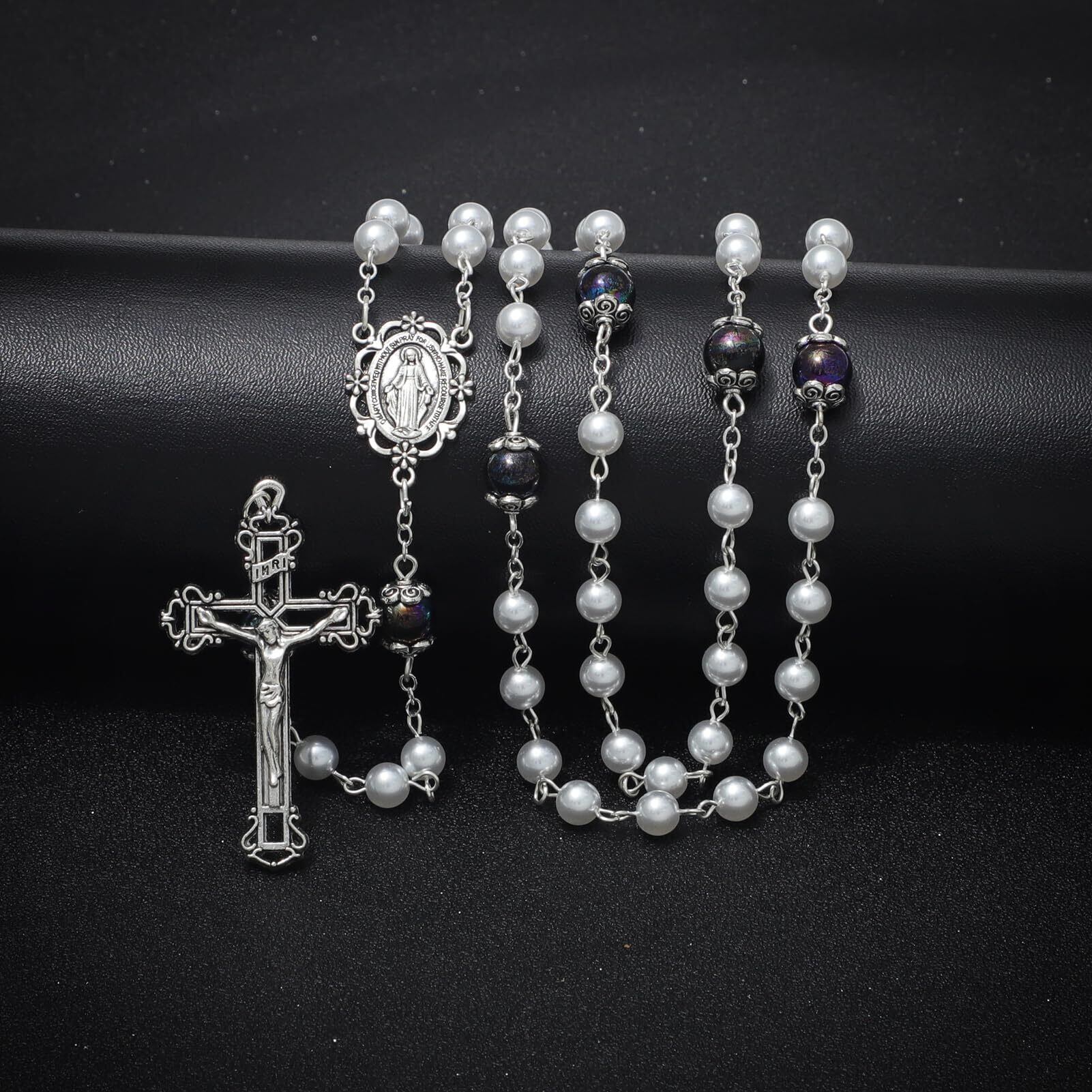 【パールロザリオ】カトリックロザリオは53個の白いガラスパールビーズと6個の黒いガラスパールビーズでできており、聖母マリアのメダルとイエスの十字架で飾られ、豪華で重量感のある絶妙なデザインのロザリオです。