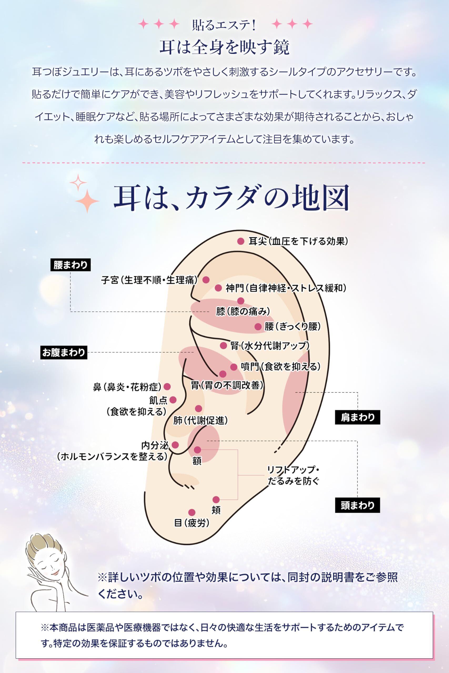 2【やさしい初心者向けの設計!】本商品は初心者にもやさしい設計で、耳ツボシールとして簡単に装着できます。特別なツールは不要で、短時間でお手軽に楽しむことができるため、耳元をおしゃれにしたい方にぴったりです!