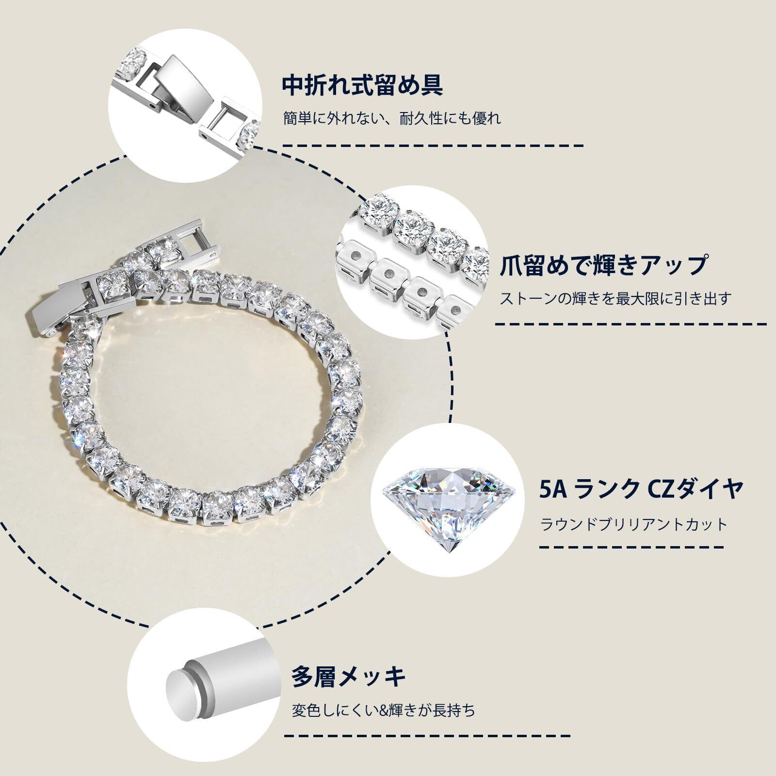 3【多彩なスタイルにマッチ!】このテニスブレスレットは、シンプルでありながら存在感のあるデザインなので、カジュアルなファッションからフォーマルなスタイルまで、幅広くコーディネートが楽しめます。あなたの個性を引き立てるおしゃれアイテムとして大活躍します!