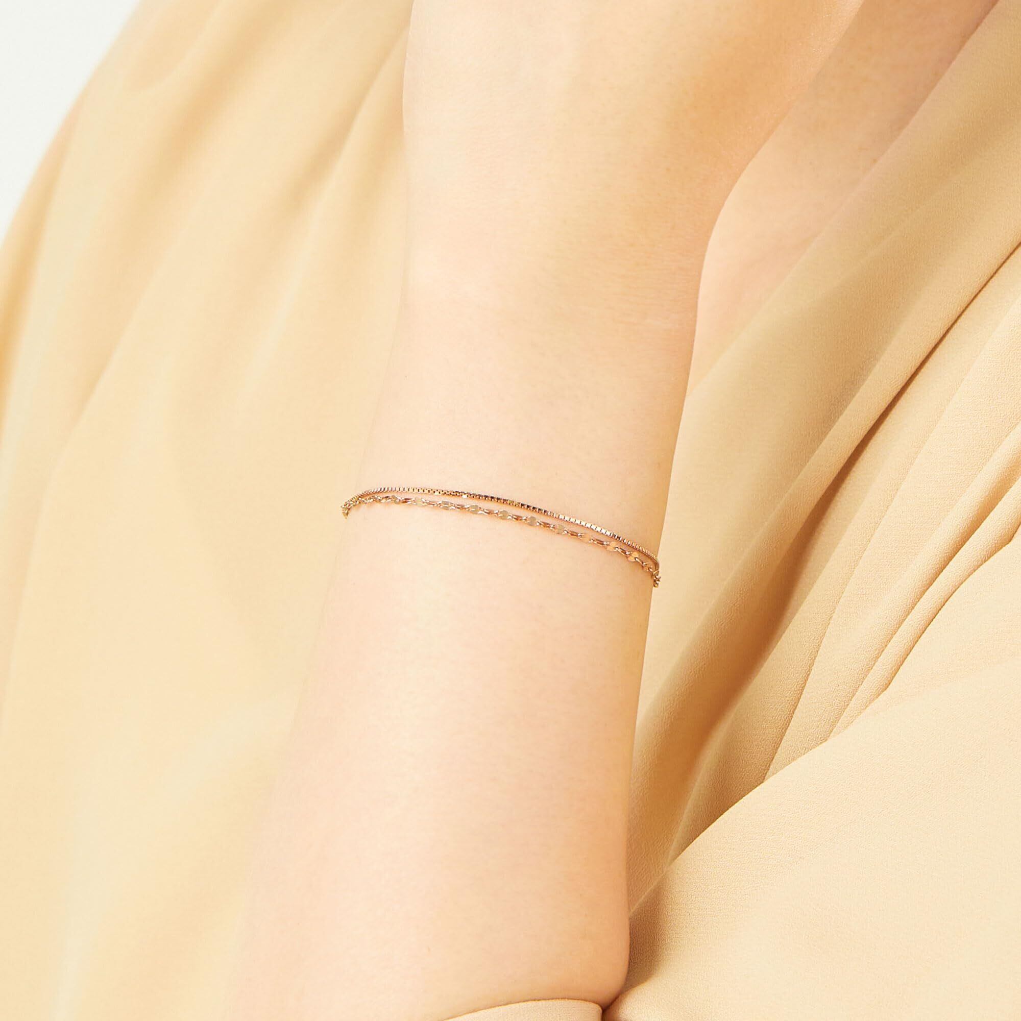 異なる2種類のチェーンが手首できらきらと輝くブレスレット。艶のあるチェーンと花びらのようなチェーンが2連になっているデザイン。繊細で女性らしい手元に。