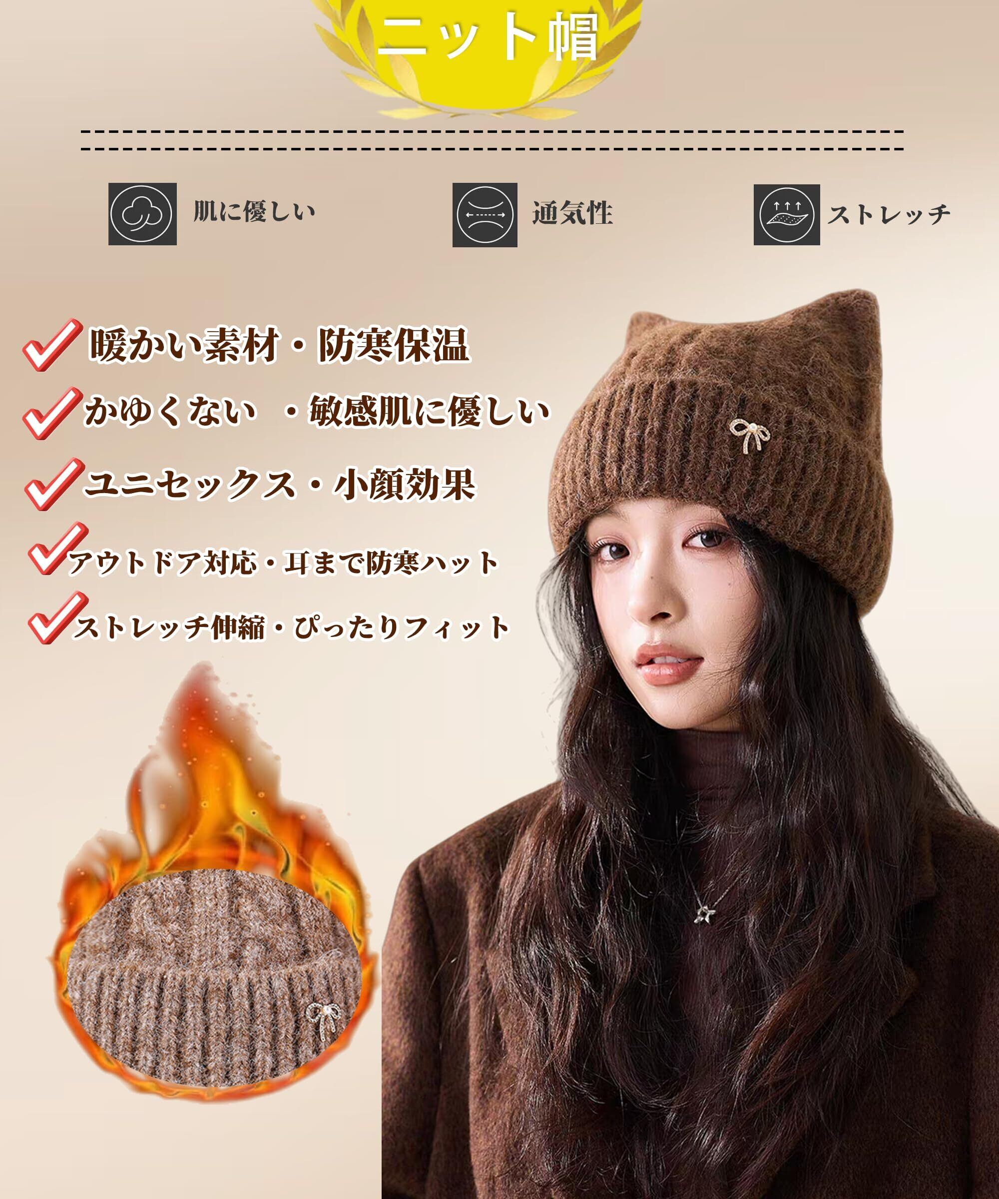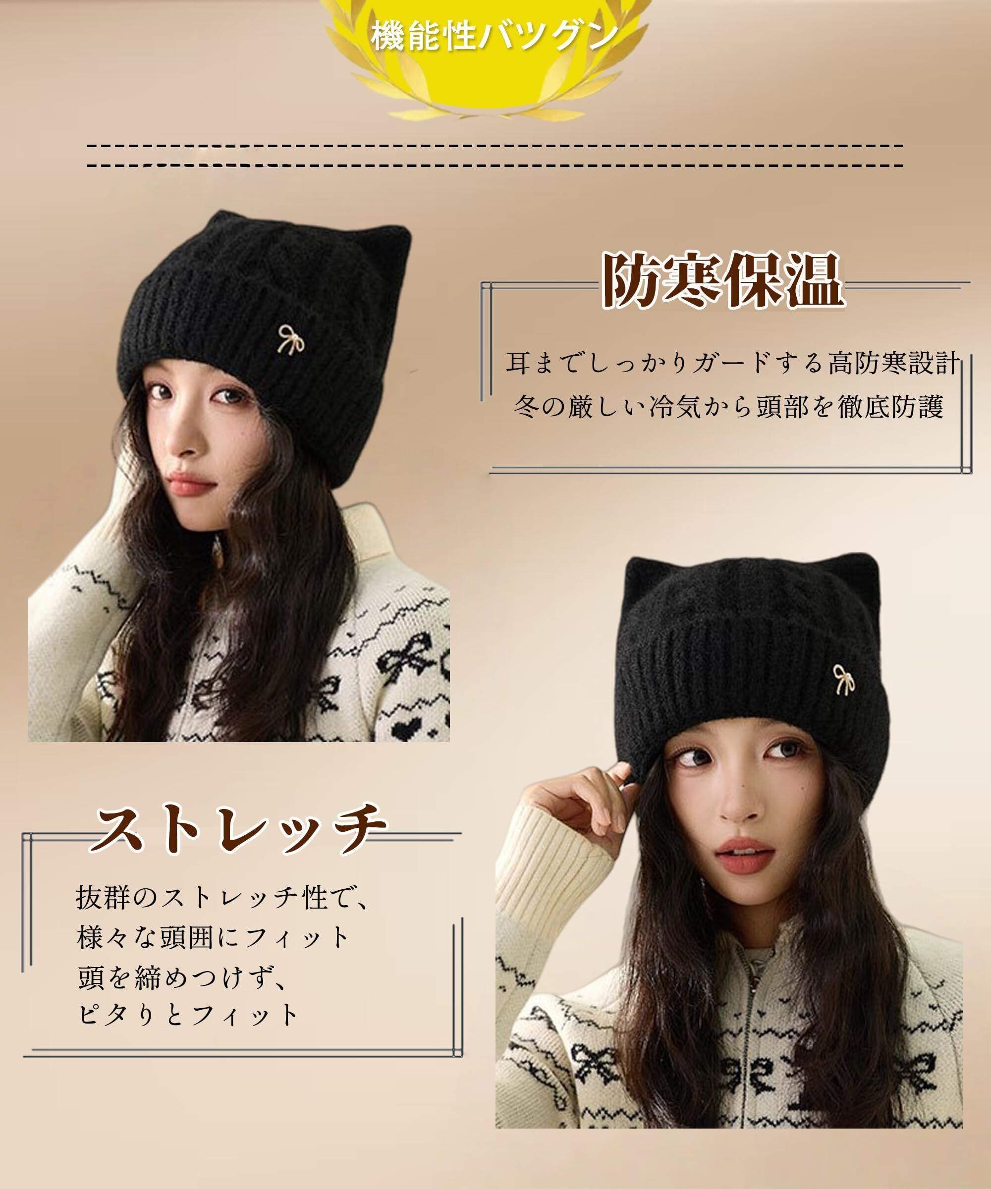 【特価商品】[Karsaer] ニット帽 レディース 秋冬 猫耳 帽子 防寒 暖かい 肌に優しい 厚手 ふわふわ ニット帽子 可愛い 小顔効果 伸縮性 柔らかい ビーニー帽 通勤 通学 G0226 | maimaiwalnut