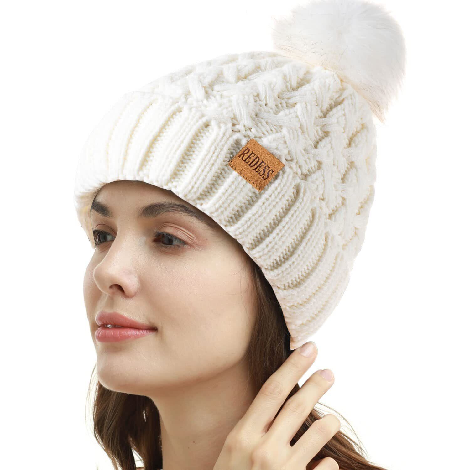 【新着商品】[REDESS] レディース 冬用ポンポンビーニー帽 暖かいフリース裏地付き 厚手 スラウチスノーニット スカルスキーキャップ | maimaiwalnut