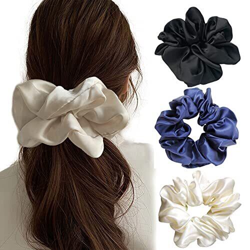 【数量限定】シュシュ シフォン シュシュ おしゃれ 大人 ヘアロープ ヘアゴム 髪飾り シンプル ヘアアクセサリー 大人 ヘアアクセサリー サテン エレガント 大きめ 特大 無地 3色セット (Blue,black,white) | maimaiwalnut
