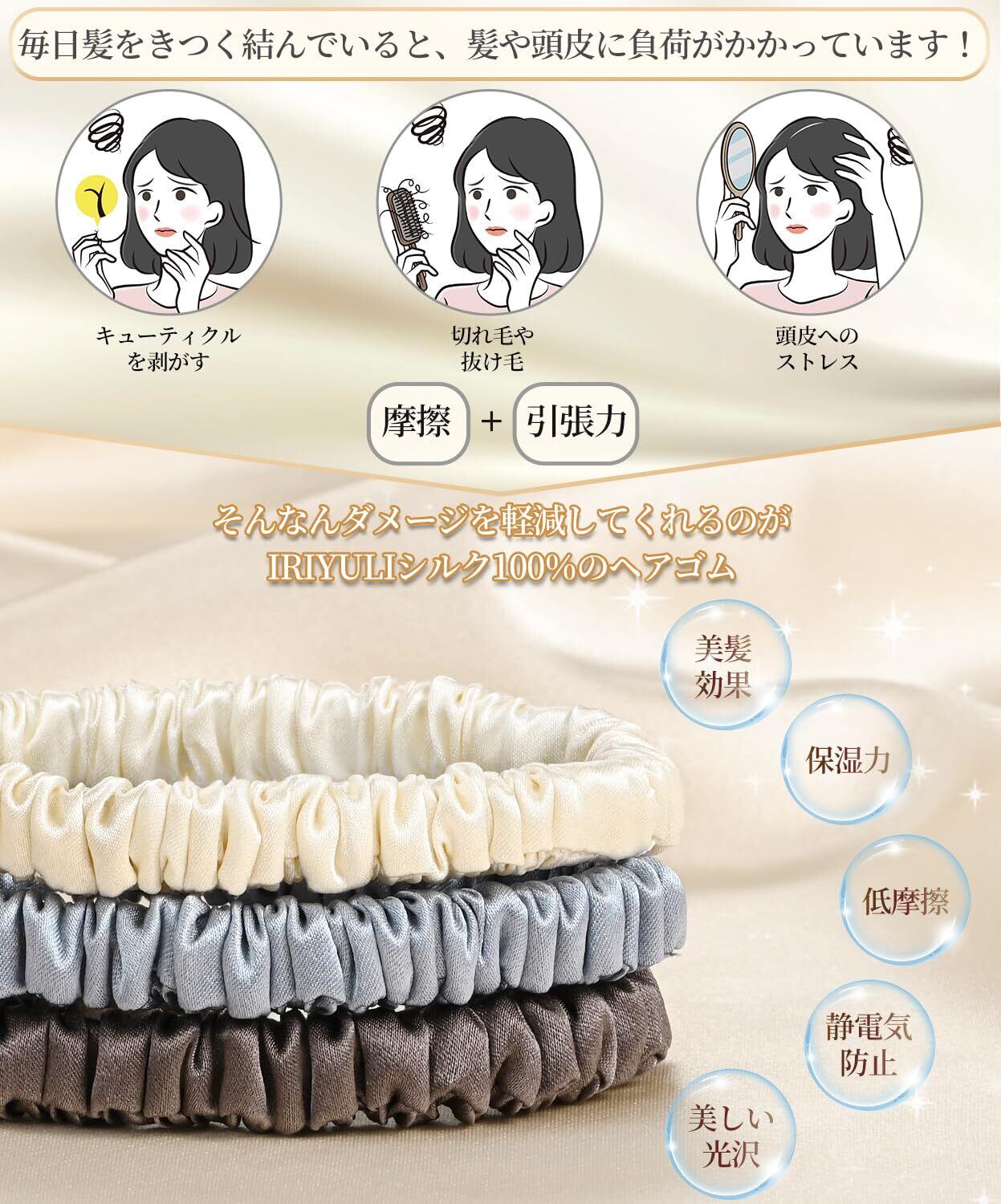 【在庫処分】シルク ヘアゴム 3個セット 100%天然シルク 6A級 摩擦軽減 静電気防止 髪に優しい 跡がつかない 髪ゴム 高弾性 シュシュ おしゃれ 大人 女性 IRIYULI (ブラック*ブラウン*ダークグレー)